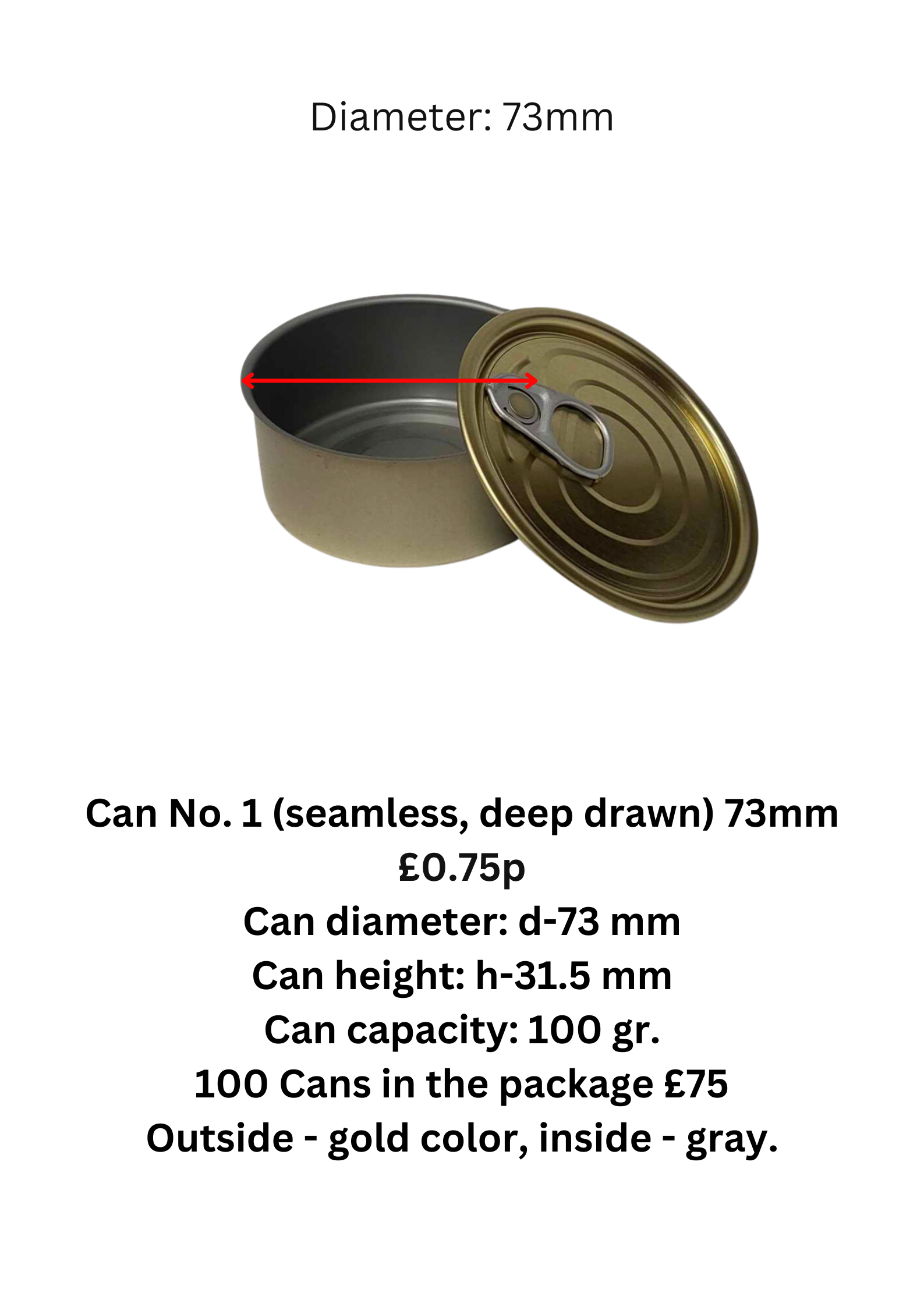 100 x Cans 73mm by 31.5mm Outside - gold colour, inside - gray.