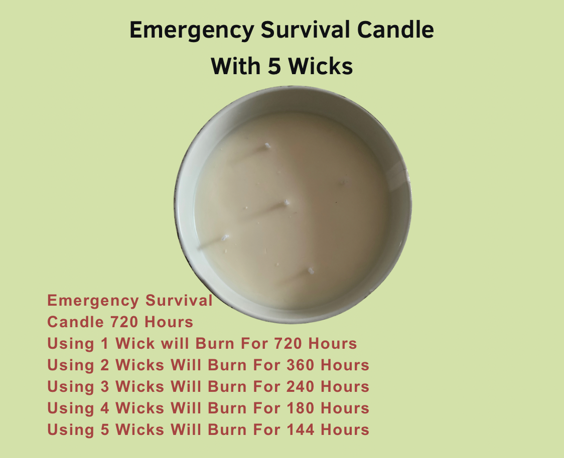 This Emergency Candle will burn for up to 720 hours using 1 wick.